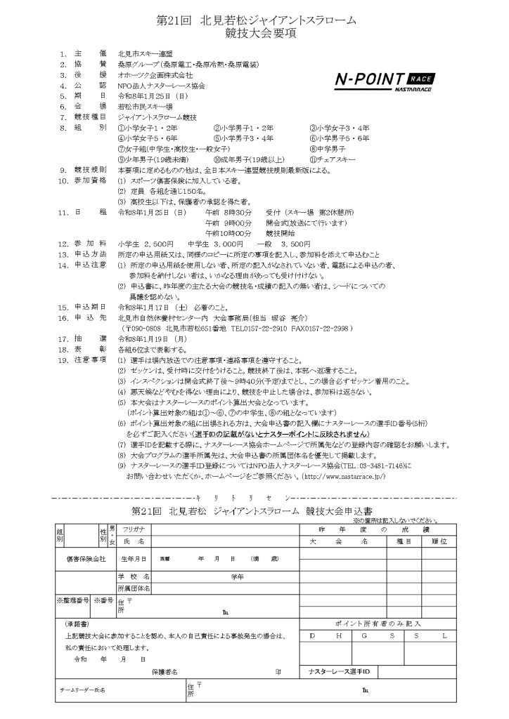 【北見若松GS大会】大会要項 2025-12-26 最終更新日時 : 2025-12-26 kousya-admin 令和8年1月25日(日)に開催される第21回北見若松ジャイアントスラローム競技大会の大会要項をアップします。